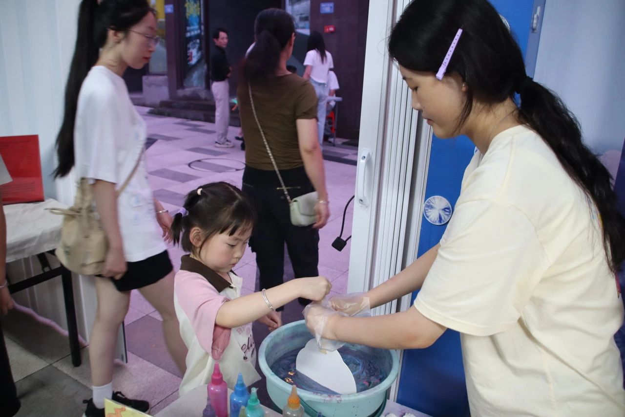 在工作人员的指导下,实践队员化身“非遗传承人”,充当每个非遗展位的志愿者,为广大群众介绍非遗并手把手指导参与非遗体验。在漆扇展位上,队员正在为素白扇面注入绚丽色彩;植物染展区,蓝靛染料在棉布上晕开古朴纹样;串珠手链,一珠一线间,一条精美的手串精美呈现。队员李小阅在体验后感叹:“亲手做的时候才懂,一珠一线都是耐下心来的功夫,这和学习多像啊——只有得沉住气琢磨细节,才能做出像样的成果,这正是我们该向老手艺学的专注与坚持。”
