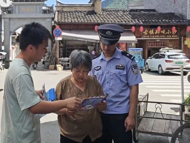 活动中,实践队员和民警手持精心策划的宣传册,沿着古镇走村入户开展防诈禁毒知识科普,“阿姨,这是反诈禁毒的科普材料,上面这个二维码是国家反诈中心的APP”实践队员们耐心地向居民们讲解着各种诈骗、毒品传播手段的特点和防范措施,用生动的案例和浅显易懂的语言让居民们深刻认识到毒品的危害性和防诈的重要性,进一步将防诈禁毒的知识如春风化雨般播撒进村民们的心田。
