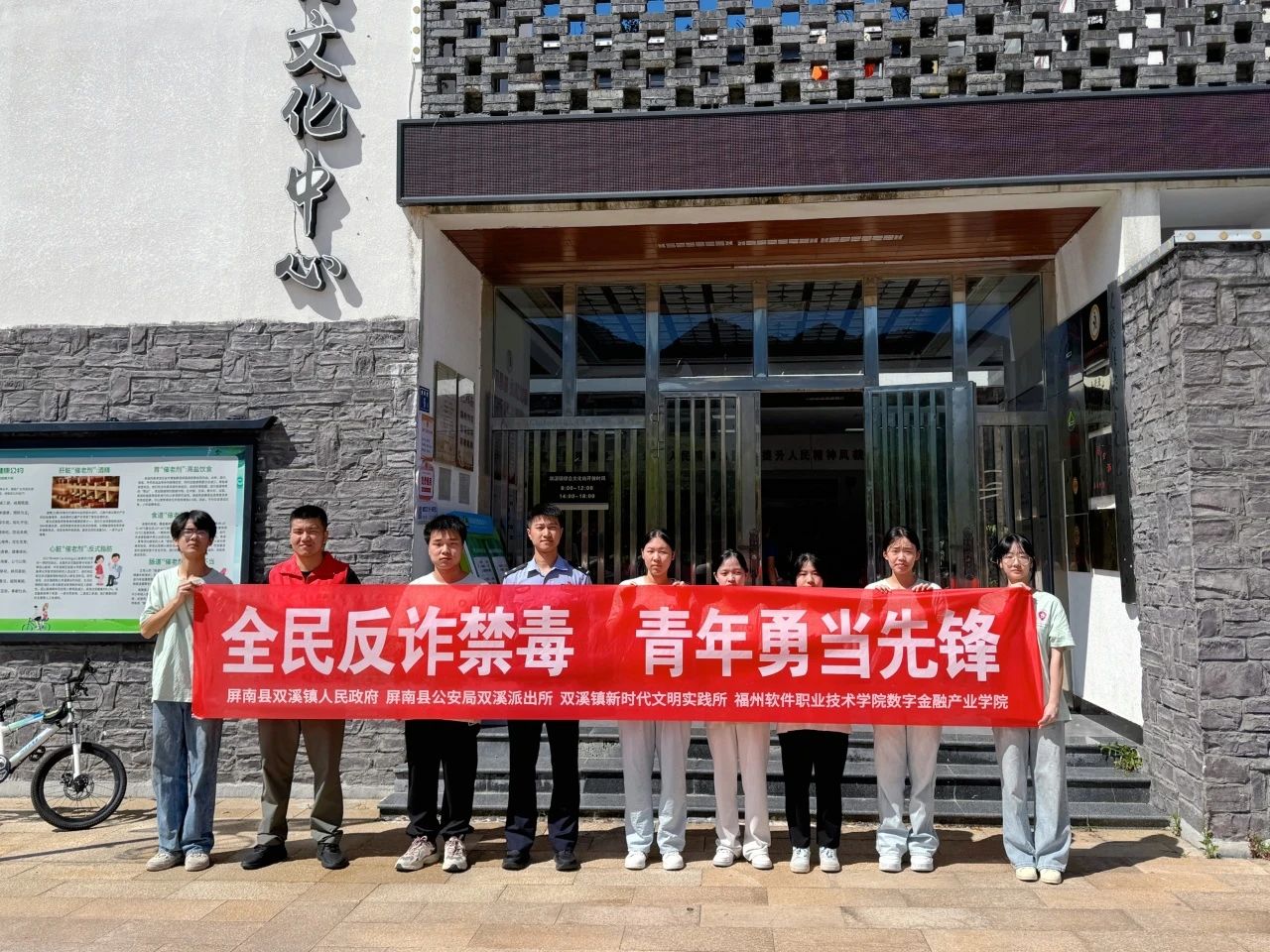 为深入贯彻落实习近平总书记皇冠即时比分:新时代公安工作的重要论述,发挥共青团实践育人优势,进一步提升全民反诈禁毒意识,增强对电信网络诈骗犯罪和禁毒的应对能力,营造全民反诈禁毒工作新格局,7月22日,由屏南县双溪镇人民政府、屏南县公安局双溪派出所、双溪镇新时代文明实践所、福州软件职业技术学院数字金融产业学院主办,数字金融产业学院薪火暑期社会实践服务队承办的“全民反诈禁毒,青年勇当先锋”防诈禁毒主题宣传在双溪古镇开展。