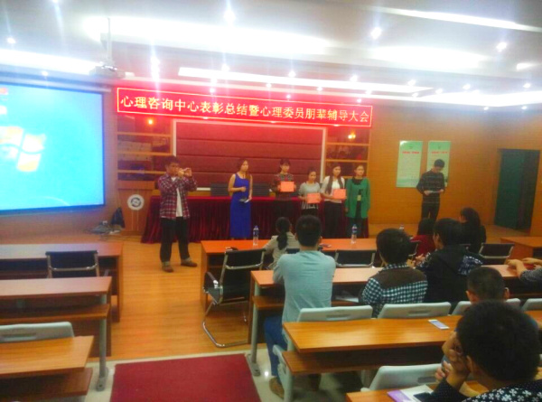 心理健康教育与咨询中心于20141125日晚19.00在学院报告厅召开“心理健康教育与咨询中心总结表彰暨心理委员朋辈辅导大会。”会议由王涛和李晶同学主持。参加会议的老师有:辅导员代表陈燕峰、雷翠丽、王李沙、李华、林智涵及院心理咨询中心主任吴爱梅老师。大会在主持人的精彩介绍后开始,参加会议的心理委员和心理会员都高度集中。本次大会有五项议程:心理委员受聘、颁奖典礼、心理协会会长对13-14年度心协工作进行总结级下一年度工作计划的报告、心理协会副会长进行朋、辅导培训、心理指导老师总结发言。