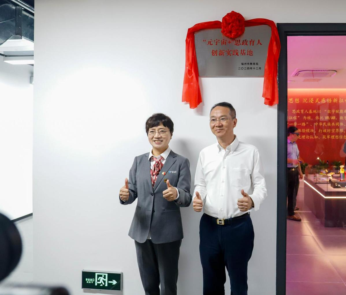 启动仪式结束后,学校迎来了两个重要的揭牌仪式。学校理事长俞飚与学校第一任党委书记吴彬镪共同为学校展览馆揭牌,这座展览馆承载着学校20年的发展历程,是学校办学成果的集中展示。福州市委教育工委副书记,市教育局党组成员、副局长念琪与学校党委书记林莺为 “元宇宙” 思政育人创新实践基地揭牌,标志着学校在思政教育创新方面迈出了重要一步。该基地运用元宇宙技术,为学生提供沉浸式的思政学习体验,将思政教育与现代科技深度融合,为培养具有坚定理想信念的新时代人才提供了有力支撑。