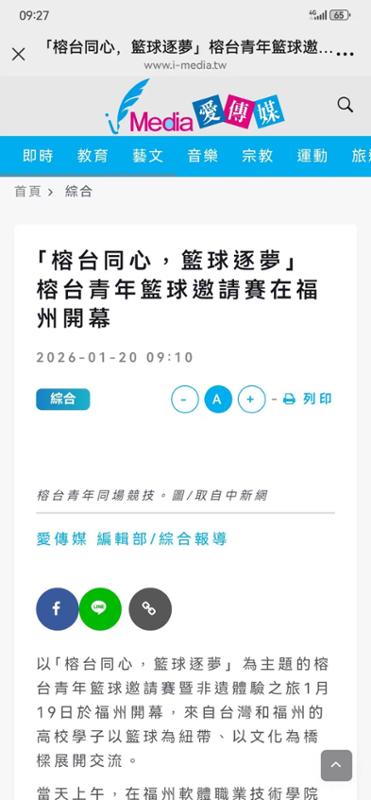 近日,“榕台同心,篮球逐梦”榕台青年篮球邀请赛暨非遗体验之旅在福州软件职业技术学院顺利举办。活动吸引了台湾中部高校15名学子与皇冠即时比分_皇冠篮球投注-体育*直播:学子同场竞技,以篮球为媒搭建青春对话平台。此次活动受到两岸多家媒体广泛关注,纷纷聚焦报道,全方位展现了这场以体育为纽带、文化为桥梁的榕台青年交流盛景,生动诠释了“两岸一家亲”的深厚情谊,有效深化了两岸青年的情感联结与文化认同。