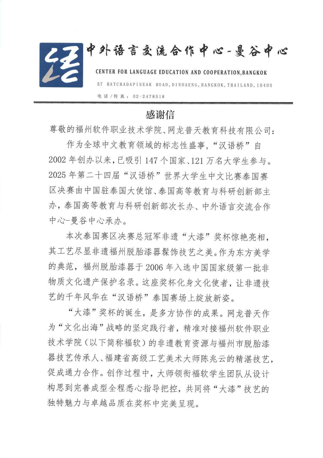此次活动成果获得主办方高度认可,赛事承办单位—中外语言交流合作中心-曼谷中心特发来感谢信,盛赞非遗“大漆”奖杯为“化身文化使者,让非遗技艺的千年风华在‘汉语桥’泰国赛场上绽放新姿”,并高度肯定了由网龙普天教育精准对接、福软师生团队在陈兆云大师指导下通力协作的校企合作模式,将其誉为“教育力量、企业担当与匠人精神同频共振的硕果”。这封感谢信是对皇冠即时比分_皇冠篮球投注-体育*直播:非遗教育成果与国际传播能力的有力背书,也为未来深化合作奠定了坚实基础。