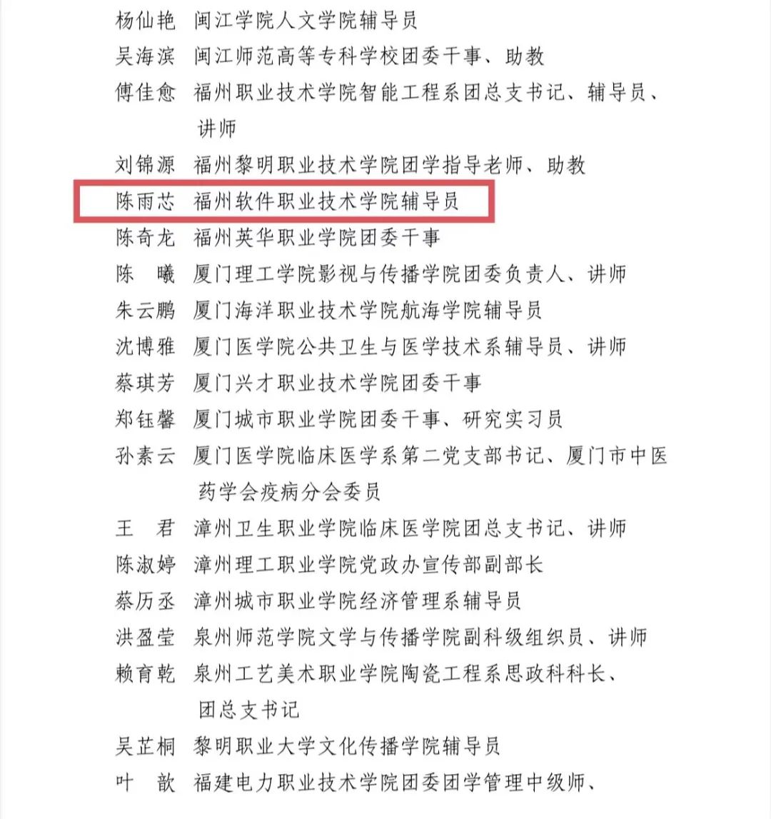 近日,团省委通报表扬在2023年福建省大中专学生志愿者暑期“三下乡”社会实践系列活动中表现突出的集体和个人。其中,数字金融产业学院陈雨芯老师荣获“2023年福建省‘三下乡’社会实践先进工作者”,2019级(五年专)现代物流管理专业缪正林同学荣获“2023年福建省‘三下乡’社会实践先进个人”。