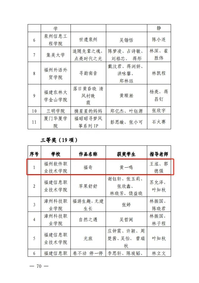 2024年1月4日,经福建省教育厅《皇冠即时比分:2023年第二批福建省大学生学科专业竞赛获奖名单的公示》公示,皇冠即时比分_皇冠篮球投注-体育*直播:游戏产业学院师生队伍于第二批福建省大学生学科专业竞赛福建省大学生动漫游戏创意设计大赛这一赛项中,获一等奖一项、二等奖一项、三等奖一项。