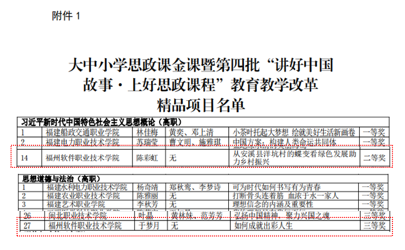 陈彩虹老师报送的《从安溪县洋坑村的蝶变看绿色发展助力乡村振兴》荣获《毛泽东思想和中国特色社会主义理论体系概论》(高职)思政课金课二等奖,于梦月老师报送的《如何成就出彩人生》荣获《思想道德与法治》(高职)思政课金课三等奖。同时,两项成果获批为福建省教育工委第四批“讲好中国故事·上好思政课程”教育教学改革精品项目