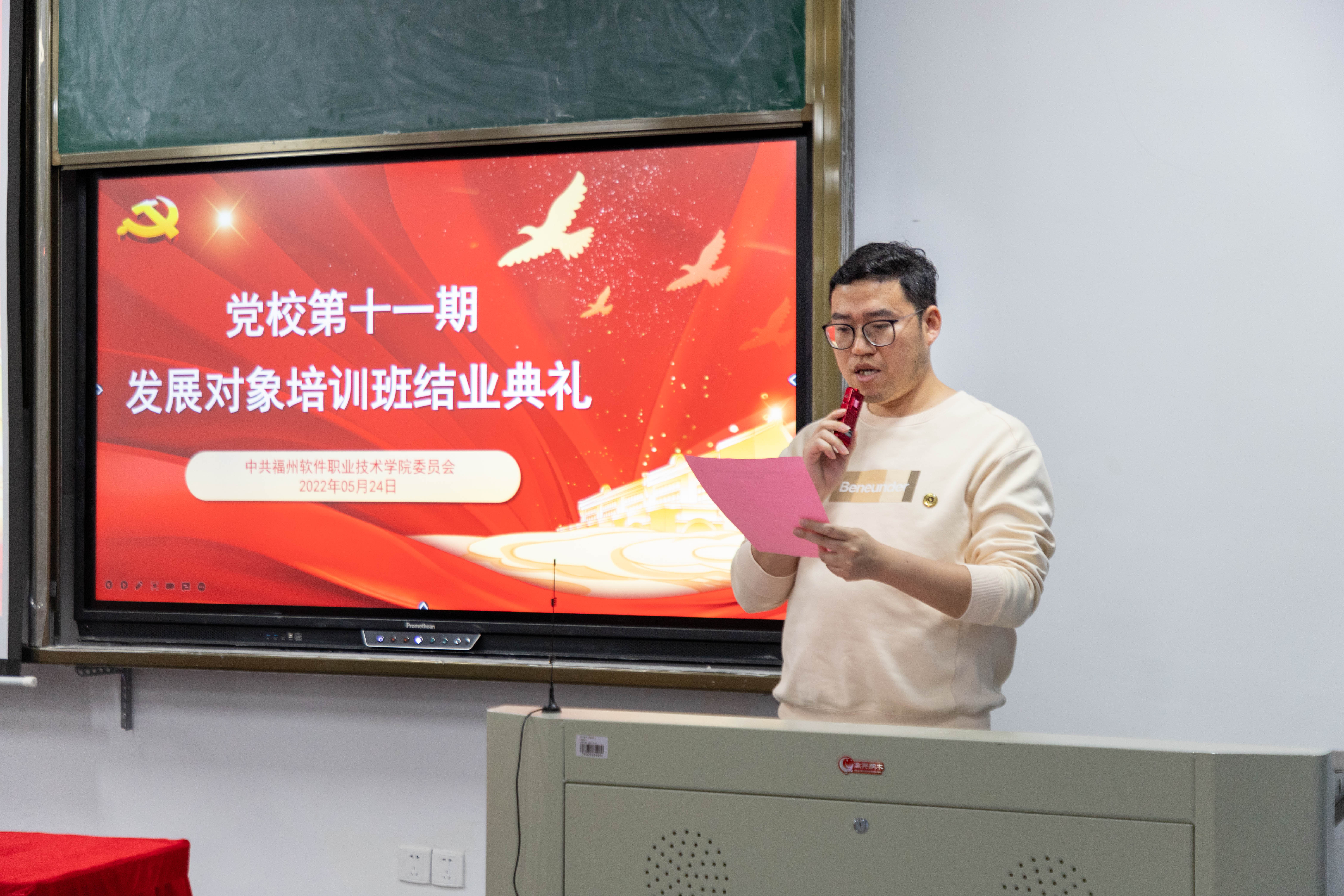 5月24日14:30,学校党校第十一期发展对象培训班结业典礼在教学楼D302举行。学校党委副书记林艺勇、党委工作部(宣传部)部长郑凯源、各党总支副书记、学生党支部书记及本次培训班全体学员参加典礼。结业典礼由党委工作部(宣传部)副部长陈燕峰主持。