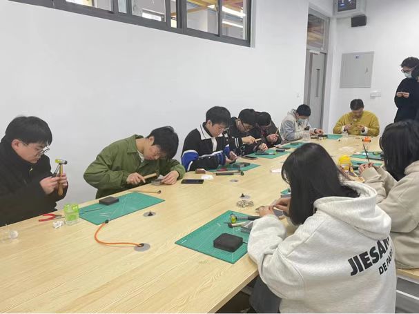 在接下来的实践课程中林伟星老师展示了各个工具的使用方法及注意事项并亲自敲打錾刻银胚、烧制银胚,让学生感受“银的温度”。