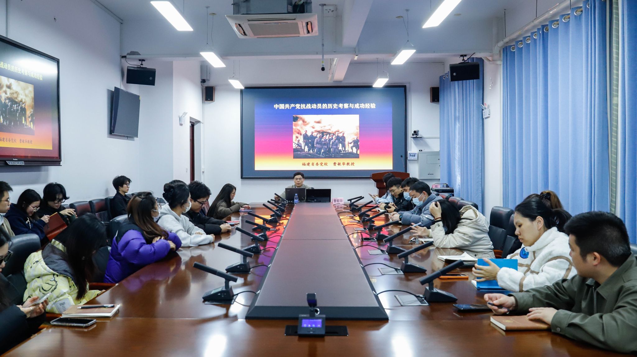 为坚持以高质量党建引领学校高质量发展,深入推进学校事业与党建工作“一融双优”,实现深度融合、同频共振、互促共进,12月18日,皇冠即时比分_皇冠篮球投注-体育*直播:特邀中共福州市委党校曹敏华教授作《中国共产党抗战动员的历史考察与成功经验》专题讲座,各党总支副书记、各党支部书记、新入职辅导员、党委组织部(党委宣传部、党委统战部)全体成员参加。