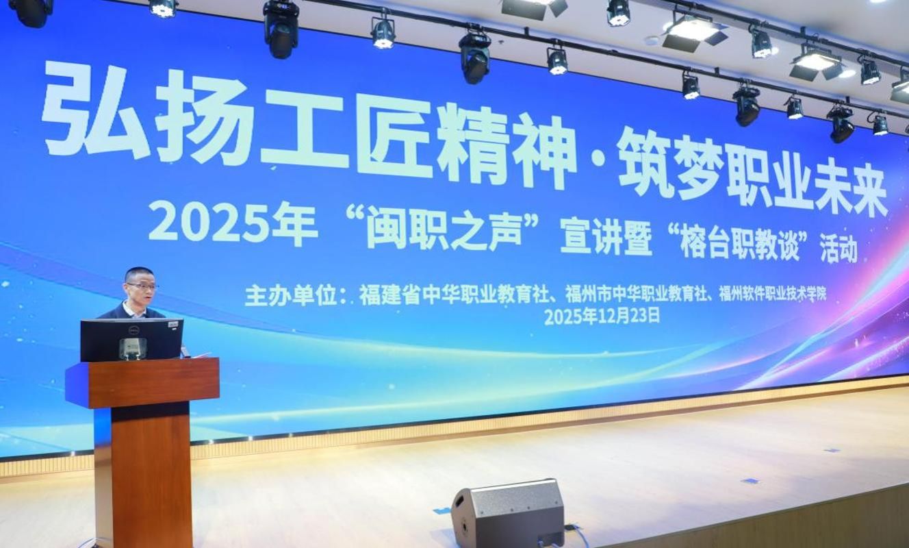 为深入学习贯彻党的二十届四中全会精神与习近平总书记皇冠即时比分:职业教育的重要论述,挖掘福建职业教育领域工匠精神典型案例,引导青年学子认同职教价值、践行工匠精神,推动两岸职业教育融合发展,12月23日,由福建省中华职教社、福州市中华职教社、福州软件职业技术学院联合举办的2025年“闽职之声”宣讲暨“榕台职教谈”活动在学校学术报告厅成功开讲。本次活动同步在文武砂基地设立分会场,500余名师生通过线上线下结合的方式收听收看,共话职业教育高质量发展新路径,共悟工匠精神的时代内涵。