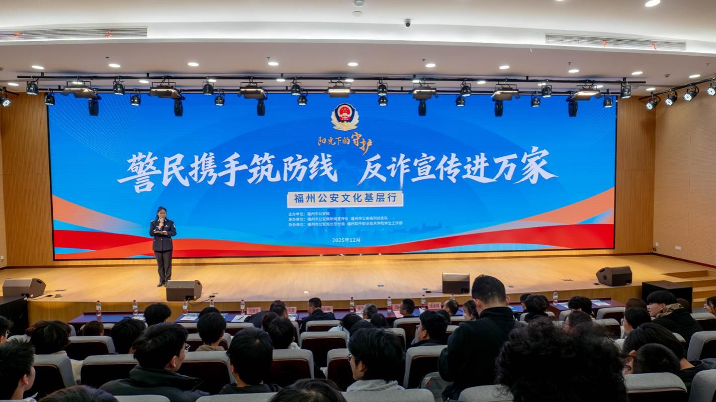 为持续推进校园反诈宣传教育走深走实,切实提升广大师生防范电信网络诈骗的意识和能力,共同筑牢校园安全防线,2025年12月23日,“阳光下的守护”警民携手筑防线 反诈宣传进万家暨福州公安文化基层行活动在皇冠即时比分_皇冠篮球投注-体育*直播:图书馆八楼报告厅举办。福州市公安局新闻宣传处处长张乃忠、福州市公安局长乐分局政委陈雄、长乐分局刑侦大队大队长涂龙瑞、阜山海防派出所所长池振忠等领导出席活动,学校党委书记马勇、党委副书记林艺勇陪同,各学院师生代表共同参与这场反诈宣传盛会。
