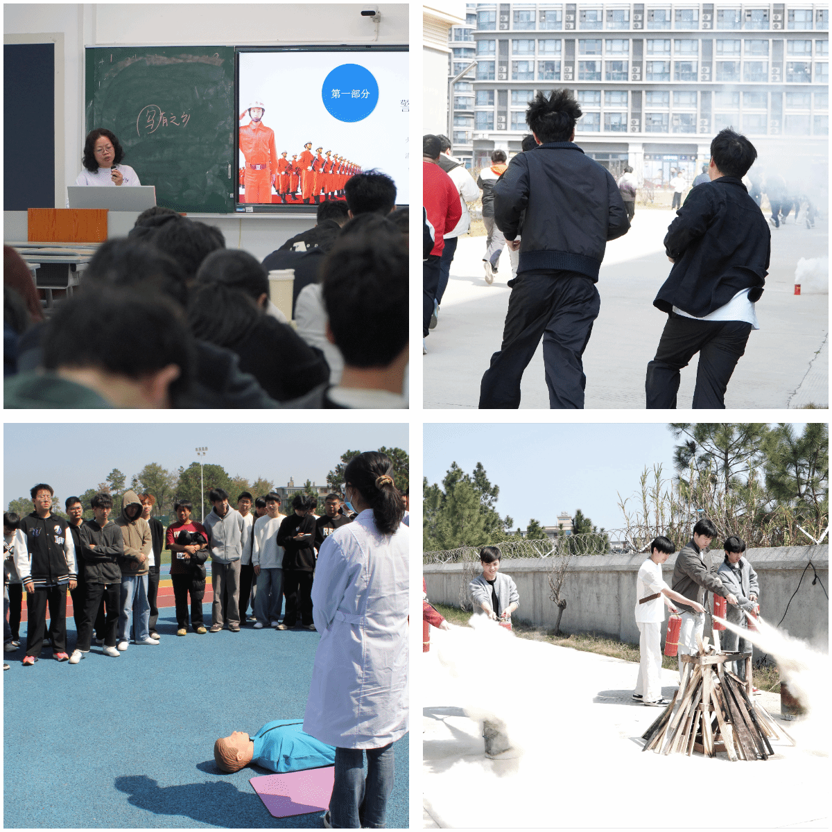 演练还设置了医疗急救教学环节,专业人员现场示范心肺复苏、海姆立克急救法等急救操作,指导师生在紧急情况下如何科学施救、保护伤员。同时,消防专员展示了一些常见的消防设施、器材,讲解了使用方法,组织同学们分组体验使用灭火器对初期火情的灭火扑救演练,切实引导和帮助同学掌握消防安全知识及初期火灾扑救知识,提升抵御应对紧急突发事件的能力。