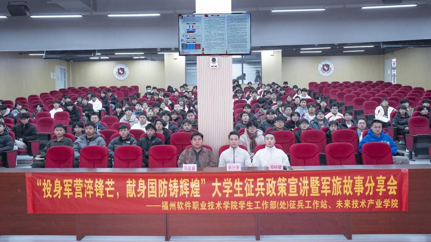 1月14日,“投身军营淬锋芒,献身国防铸辉煌”大学生征兵政策宣讲暨军旅故事分享会在L311报告厅顺利举行。未来技术产业学院产教融合基地学生工作部(处)学生管理中心主任卓兴涛,学生工作部(处)综合事务科科长易星辰受邀参会,众多学子踊跃参与。未来技术产业学院征兵工作负责人郑梓键担任主讲人,围绕报名条件及流程、学业扶持、经济优待、个人发展等核心内容展开详细解读。他结合真实部队情况,将各项政策条款转化为通俗易懂的语言,针对同学们关心的学籍保留、升学优惠、就业扶持等问题逐一答疑,让大家对征兵政策有了全面且深入的了解。