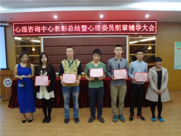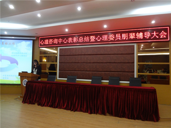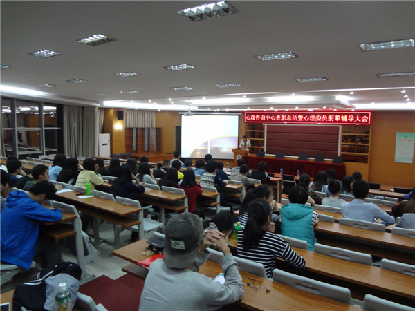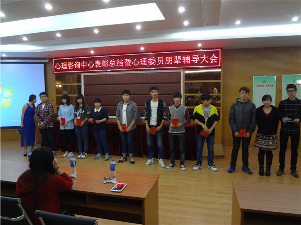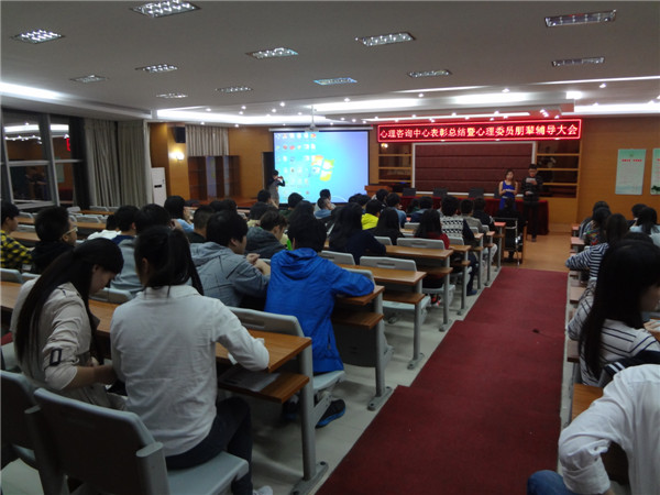 心理健康教育与咨询中心于20141125日晚19.00在学院报告厅召开“心理健康教育与咨询中心总结表彰暨心理委员朋辈辅导大会。”会议由王涛和李晶同学主持。参加会议的老师有:辅导员代表陈燕峰、雷翠丽、王李沙、李华、林智涵及院心理咨询中心主任吴爱梅老师。大会在主持人的精彩介绍后开始,参加会议的心理委员和心理会员都高度集中。本次大会有五项议程:心理委员受聘、颁奖典礼、心理协会会长对13-14年度心协工作进行总结级下一年度工作计划的报告、心理协会副会长进行朋、辅导培训、心理指导老师总结发言。