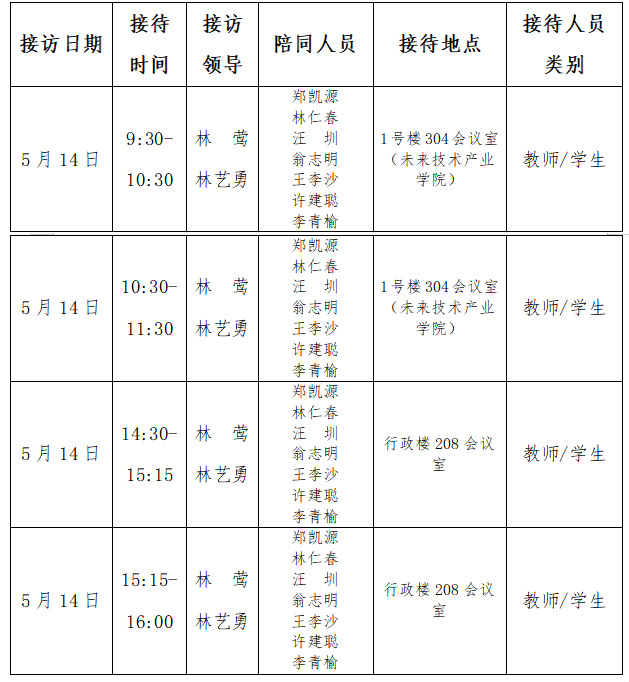 为深化新时代高校民主管理,持续拓展“我为师生办实事”长效机制,扎实推进深入贯彻中央八项规定精神学习教育,通过 “零距离沟通、清单化落实、闭环式反馈、常态化提升”,切实解决师生急难愁盼,助力学校治理能力现代化。经研究决定,开展2024-2025学年第二学期书记接访接待日活动。现将有关事宜通知如下:
