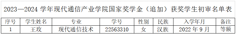 根据《福建省教育厅皇冠即时比分:追加下达2024年国家奖学金名额的通知》(闽教学[2024]23号)文件要求,经学生申报、辅导员审核、学院奖学金评审委员会评审等环节,现将2023-2024学年现代通信产业学院国家奖学金拟推荐名单公示(追加)如下,公示期为3个工作日(2024年11月6日—2024年11月8日)。在此期间欢迎广大师生以来信来访的形式向现代通信产业学院反映情况,发表看法和意见,来信邮箱:frtxxy@126.com。
