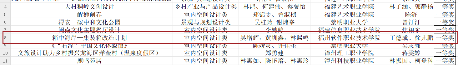 近日,2023年第三届美丽中国生态可持续创新设计艺术大赛(福建赛区)评审工作落下帷幕,由我院王德成、徐芃鹏老师指导的作品《箱中海岸—集装箱改造计划》,荣获一等奖,王德成、陈琳老师指导的作品《曐》、《寻梦乐园B.C 2066》,荣获二等奖、三等奖。另,三位老师均获得本次大赛“优秀指导教师奖”。