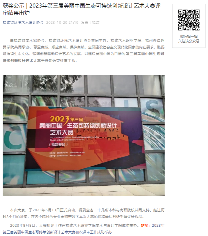 据悉,2023第三届美丽中国生态可持续创新设计艺术大赛(福建赛区)是由福建省美术家协会、福建省环境艺术设计协会共同主办,福建艺术职业学院、福州外语外贸学院共同承办的以建设美丽中国为目标的第三届美丽中国生态可持续创新设计艺术大赛。